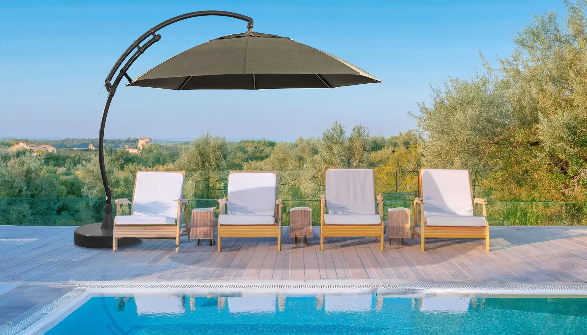 Bij een standaard parasol zit de mast steeds in het midden, terwijl deze bij een hangparasol decentraal staat en het parasoldoek boven het oppervlak zweeft. Geen storende mast in het zichtveld dus.