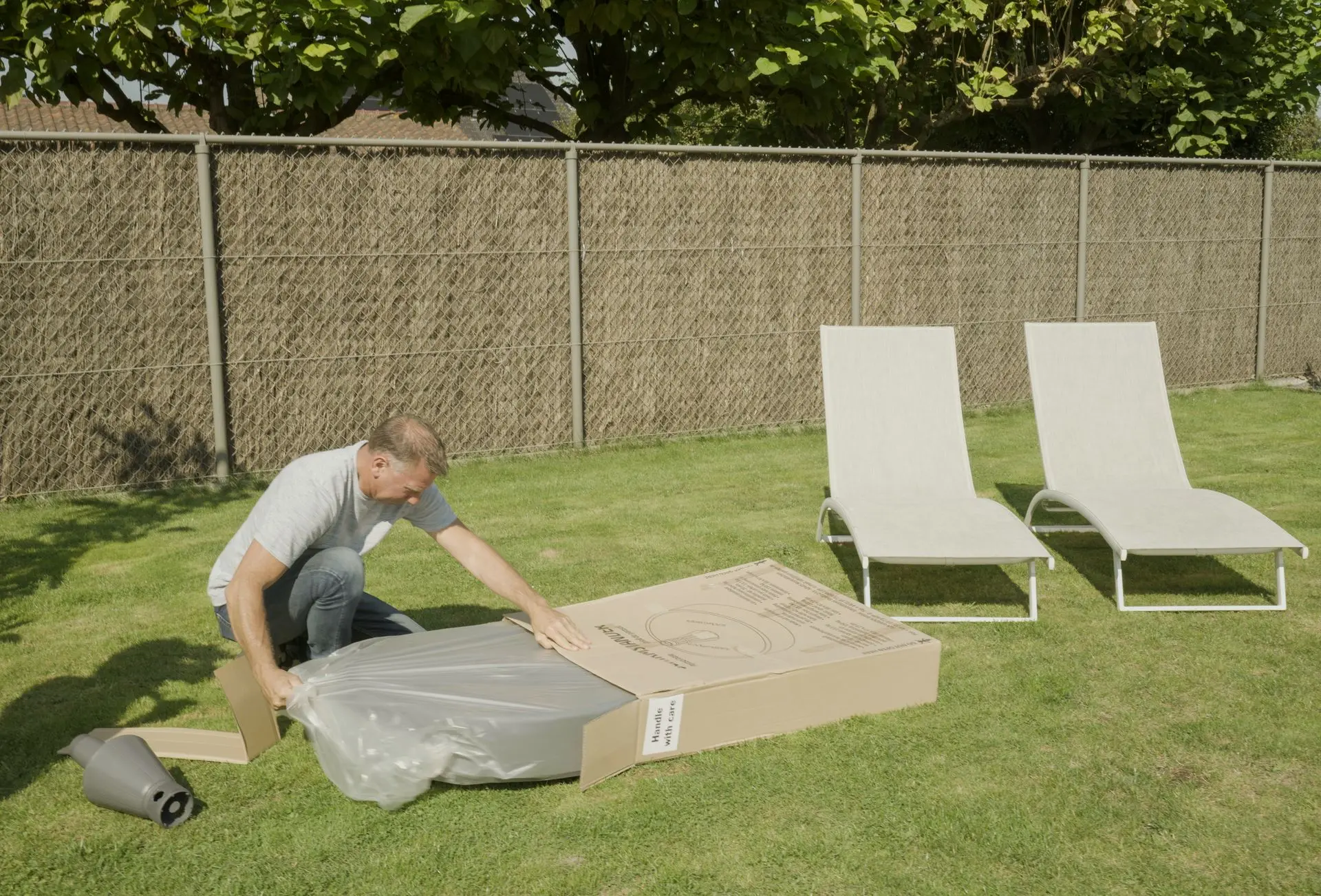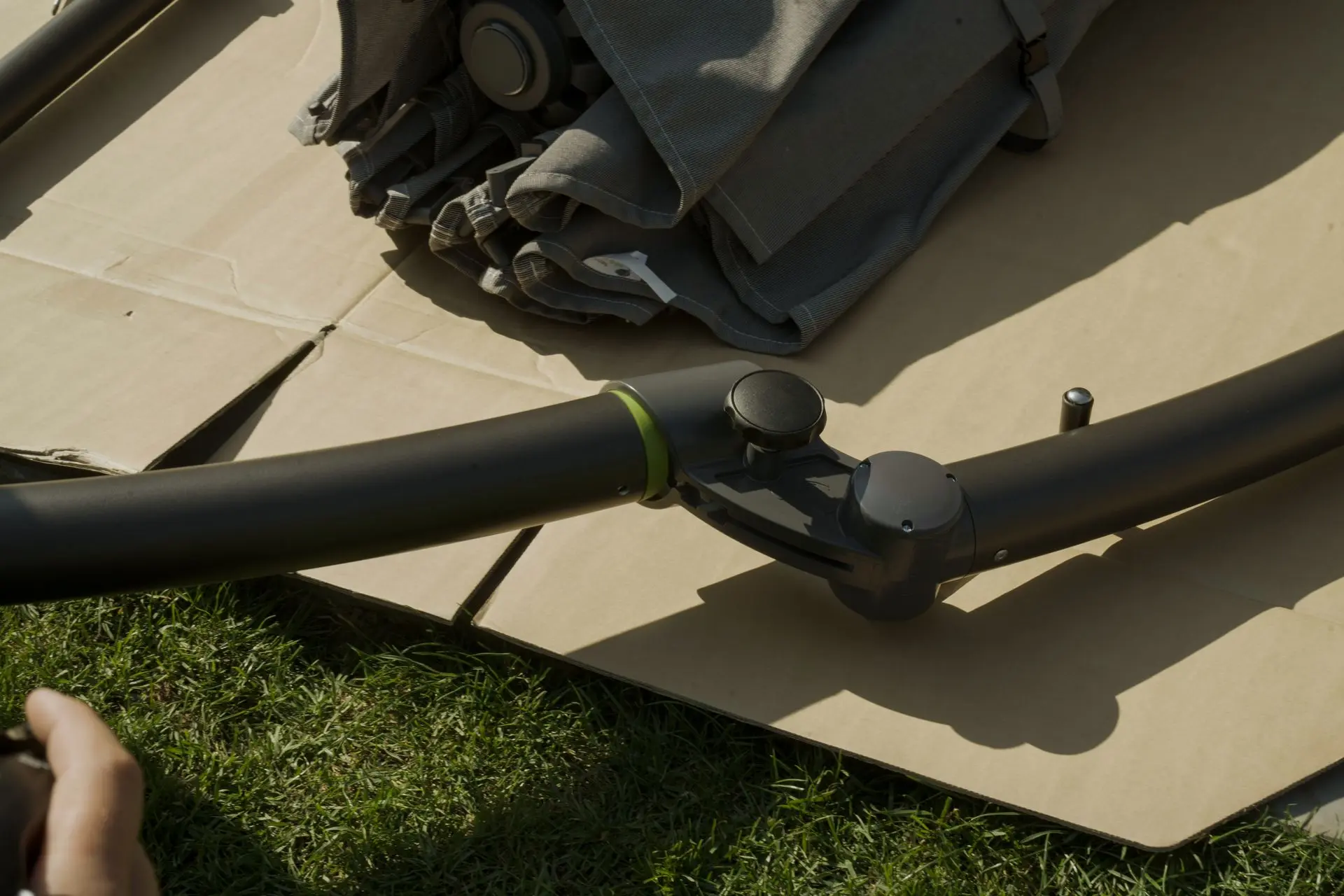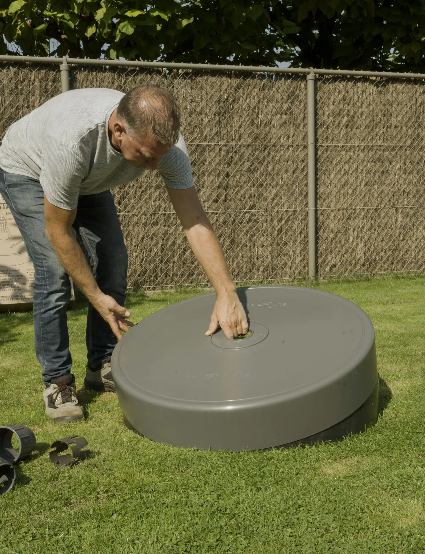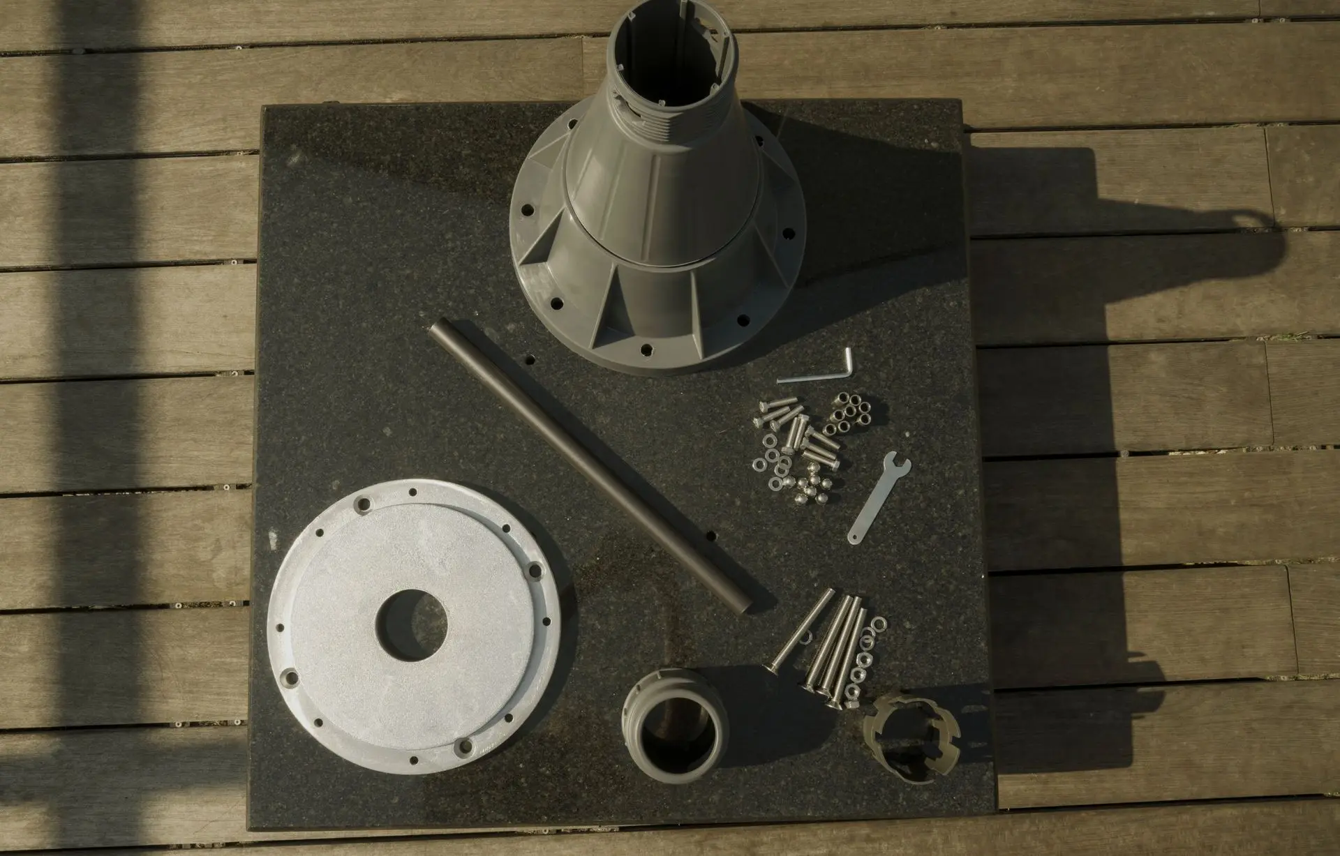 - Haal de voet van de parasol uit de verpakking en plaats deze op een vlakke, stevige ondergrond